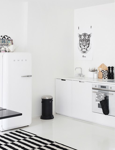 Dnes se s vámi chci podělit o fotky krásného bytu, který patří Suki (blog Varpunen). Miluju byty, které jsou jednoduché a osobité zároveň. A vůbec nejlepší je, když je té originality dosaženo pomocí malých vychytaných detailů: například černobílého obrázku tygra přilepeného černou izolepou nad kuchyňskou linku. Starou obyčejnou kuchyňskou linku můžete zase skvěle vylepšit pomocí lepící fólie vystříhané do geometrických tvarů, které se v kuchyni opakují. A můj jednoznačný favorit v tomto bytě je jídelní stůl v kombinaci s úžasným kobercem a povedeným mixem židlí!